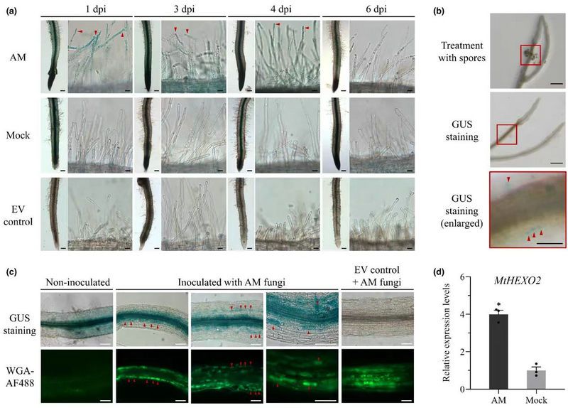 中山大學生命科學學院Christian Staehelin教授團隊發現了一種截形苜蓿β-N-乙酰己糖胺酶(MtHEXO2),并從生化特性和生物學功能等方面進行探究。首先,通過對MtHEXO2基因進行時空特異性表達分析發現,MtHEXO2基因不僅能夠快速響應叢枝菌根真菌和苜蓿中華根瘤菌的誘導在根毛中表達,而且對于相應的共生信號分子(即COs 和LCOs)也表現出相似的表達模型。并且,MtHEXO2基因的表達還與叢枝結構相關聯(圖1)。另外,在共生信號通路缺失突變體植物中MtHEXO2基因的表達不能夠表現出上述模型,這說明MtHEXO2基因的表達依賴于共生信號通路的調控。蛋白亞細胞定位分析表明,MtHEXO2蛋白是一個可以被分泌到共生界面的胞外蛋白。此外,生化特性分析結果證明,MtHEXO2蛋白能夠特異性水解COs而非LCOs。進一步的突變體表型分析結果顯示,hexo2突變體植株和野生型植株在結瘤數量和根瘤形態方面沒有表現出明顯的差異;然而與野生型植株相比,hexo2突變體植株的叢枝菌根真菌定殖率和叢枝菌根共生相關基因的表達水平均顯著降低(圖2)。并且,在hexo2突變體中重新表達MtHEXO2基因可以恢復其野生型表型。