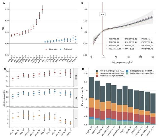 基于前期研究基礎(JACC 2021),中山大學公共衛生學院劉躍偉課題組聯合江蘇省疾病預防控制中心孫宏主任醫師、國家氣象信息中心師春香研究員和美國馬里蘭大學韋晶博士系統評估了極端溫度事件和PM2.5暴露對心肌梗死死亡的影響及其交互作用。該研究基于江蘇省死因監測系統、中國氣象局陸面數據同化系統(CLDAS V2.0)和中國高分辨率大氣污染物(CHAP)數據集,采用病例交叉設計對江蘇省2015-2020年間20.3萬名因心肌梗死死亡居民進行分析,定量評估研究對象死亡當天熱浪、寒潮暴露以及死亡當天與前一天PM2.5暴露與心肌梗死死亡之間的暴露-反應關系,量化極端溫度事件和PM2.5的相加交互作用,并估算其超額死亡。結果發現,熱浪、寒潮和PM2.5暴露與心肌梗死死亡風險升高有關(圖1-A、圖1-B),且女性和老年人群更為敏感。同時暴露于熱浪和PM2.5對心肌梗死死亡風險的影響存在顯著的協同效應,且熱浪定義越嚴格,協同效應越強(圖1-C);而同時暴露于寒潮和PM2.5對心肌梗死死亡風險的影響不存在協同效應。經估算,研究期間江蘇省約5668例(2.8%)心肌梗死死亡病例可歸因于極端溫度事件和PM2.5暴露(圖1-D)。