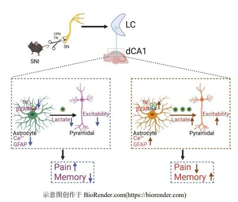 此研究利用坐骨神經(jīng)分支選擇性損傷模型(SNI)小鼠,發(fā)現(xiàn)10天后即出現(xiàn)共病,同時(shí), 背側(cè)海馬CA1星形膠質(zhì)細(xì)胞鈣信號(hào)對(duì)機(jī)械痛刺激的反應(yīng)明顯減弱、星形膠質(zhì)細(xì)胞GFAP表達(dá)量以及分支明顯減少,乳酸含量明顯降低,離體全細(xì)胞膜片鉗發(fā)現(xiàn)錐體神經(jīng)元內(nèi)在興奮性明顯下降。而在 SNI 鼠 CA1區(qū)外源性補(bǔ)充乳酸能夠提高機(jī)械痛閾、引起條件位置性偏愛(ài)、提高新奇事物認(rèn)知能力并提高錐體神經(jīng)元的興奮性。相反,在正常動(dòng)物用糖原磷酸化酶抑制劑抑制 CA1 乳酸合成或通過(guò)抑制單羧酸轉(zhuǎn)運(yùn)體阻斷乳酸轉(zhuǎn)運(yùn)到錐體神經(jīng)元,均引起正常動(dòng)物痛覺(jué)過(guò)敏和記憶障礙。化學(xué)遺傳學(xué)特異性激活藍(lán)斑(LC)到背側(cè)海馬CA1 去甲腎上腺素能投射能緩解共病。同時(shí),化學(xué)遺傳學(xué)激活 LC 去甲腎上腺素能神經(jīng)元可以提高共病鼠dCA1 星形膠質(zhì)細(xì)胞鈣信號(hào),并增加乳酸釋放。這一研究發(fā)現(xiàn)了外周神經(jīng)損傷小鼠CA1星形膠質(zhì)細(xì)胞異常導(dǎo)致乳酸釋放減少,進(jìn)而引起錐體神經(jīng)元興奮性下降,最終使小鼠出現(xiàn)共病,而激活LC去甲腎上腺素能神經(jīng)元?jiǎng)t能夠緩解上述表現(xiàn)。證實(shí)了外周神經(jīng)損傷后LC去甲腎上腺素能神經(jīng)元未能充分驅(qū)動(dòng)dCA1星形膠質(zhì)細(xì)胞的乳酸釋放功能來(lái)支持錐體神經(jīng)元的興奮性,導(dǎo)致共病。這為治療神經(jīng)病理性疼痛和記憶障礙共病提供了潛在靶點(diǎn),以及提供了新的研究通路方向。