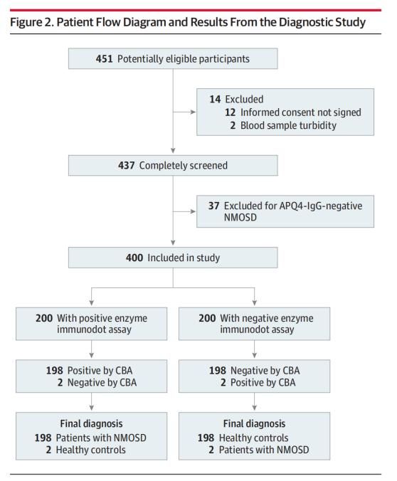 該研究在中國(廣東、福建)和韓國共檢測836例患者的血清樣本。結果顯示,與傳統的金標準CBA法對比(活細胞CBA法或者固定CBA法等),IDoT法的抗體檢測性能與CBA相當,診斷性研究結果Kappa系數為98.0%(400例患者);436例驗證者,包括275例其他疾病隊列(風濕免疫疾病等)、57例NMOSD前瞻性隨訪隊列、31例國內交叉驗證隊列、73例韓國神經免疫疾病隊列交叉驗證(NMOSD、MOGAD等),整體驗證隊列結果中,僅2例與CBA檢測不一致。因此,IDoT總體敏感性為99.4% (95%CI: 97.8% - 99.9%), 特異性為99.2%(95%CI: 98.0% - 99.8%)。