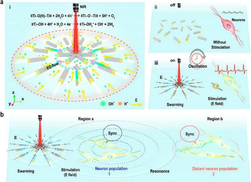 該團隊提出了振蕩納米機器人的程序化集群,其推進和集群背后的場信息作為體外與生物神經(jīng)元通信并觸發(fā)神經(jīng)振蕩的介質(zhì)。如圖2a所示,設(shè)計了一個由近紅外光驅(qū)動的高度可控的振蕩納米機器人群。納米機器人通過純水的光催化分解驅(qū)動電泳(并自建立的化學(xué)-電場梯度)。通過程序化的近紅外光照射,納米機器人群呈現(xiàn)周期性化學(xué)-電場和集體動態(tài)可逆收縮-膨脹-收縮(振蕩)行為。局部視網(wǎng)膜神經(jīng)節(jié)細胞(RGC)可以通過來自集群的振蕩電場有節(jié)奏地激活(圖2a ii和iii)。神經(jīng)元與編程的納米機器人集群節(jié)奏同步。有趣的是,在通過耦合振蕩使沒有物理接觸的神經(jīng)元群中觀察到同步周期性的波紋活動,類似于自然神經(jīng)系統(tǒng)中的振蕩網(wǎng)絡(luò)(圖2b)。共振允許原本無法到達毫米級外的神經(jīng)元信號得以傳輸,這不同于神經(jīng)元通常認為需要突觸直接連接和同步的方式。與數(shù)量有限的孤立神經(jīng)元相比,神經(jīng)元共振具有重要意義,因為大量同步神經(jīng)元群誘導(dǎo)下游神經(jīng)反應(yīng)的機會更高。節(jié)律神經(jīng)活動還允許在不同時間窗口(即節(jié)律周期的特定階段)進行神經(jīng)興奮性調(diào)節(jié),以便神經(jīng)元組可以通過鎖相神經(jīng)振蕩精確地相互作用。這代表我們的合成可編程振蕩平臺提供了與神經(jīng)元系統(tǒng)通信的新方式。
