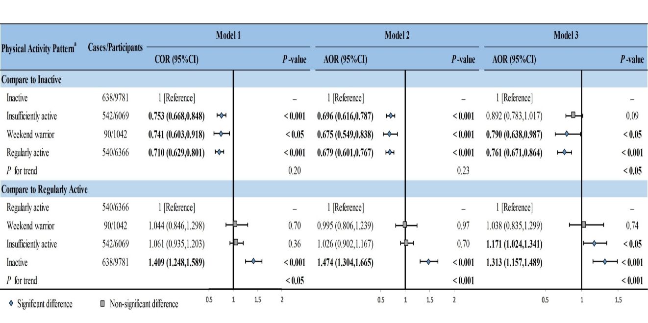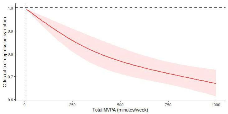 該研究通過對(duì)美國(guó)國(guó)家健康與營(yíng)養(yǎng)調(diào)查(NHANES)2007-2020年的7次橫斷面,23,258名20~80歲的成年人數(shù)據(jù)進(jìn)行分析,評(píng)估閑暇體力活動(dòng)的頻率、時(shí)長(zhǎng)和強(qiáng)度,并根據(jù)運(yùn)動(dòng)模式將參與者分成4類:不運(yùn)動(dòng):沒有報(bào)告任何MVPA;運(yùn)動(dòng)不足:MPA<150min/week且VPA<75min/week;周末戰(zhàn)士:MPA≥150min/week或VPA≥75min/week,每周只鍛煉1-2次;規(guī)律運(yùn)動(dòng):MPA≥150min/week或VPA≥75min/week,每周鍛煉超過3次。采用病人健康問卷抑郁量表(PHQ-9)對(duì)抑郁癥狀進(jìn)行評(píng)估。