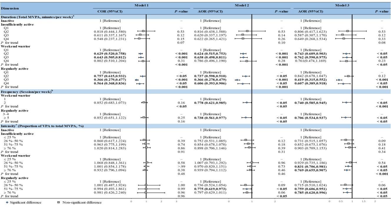 研究顯示(表1),與不運(yùn)動(dòng)個(gè)體相比,周末戰(zhàn)士的抑郁癥狀發(fā)生風(fēng)險(xiǎn)減低了21%(AOR=0.790; 95%CI: 0.638, 0.987),規(guī)律運(yùn)動(dòng)個(gè)體的抑郁癥狀發(fā)生風(fēng)險(xiǎn)降低了24%(AOR=0.761; 95%CI: 0.671, 0.864)。而運(yùn)動(dòng)不足的個(gè)體與抑郁癥狀發(fā)生風(fēng)險(xiǎn)之間的關(guān)聯(lián)不顯著(AOR=0.892; 95%CI: 0.783, 1.017)。研究還發(fā)現(xiàn),每周體力活動(dòng)總時(shí)長(zhǎng)與抑郁癥狀發(fā)生風(fēng)險(xiǎn)存在負(fù)向劑量反應(yīng)關(guān)系(圖1),無論是周末戰(zhàn)士還是規(guī)律運(yùn)動(dòng)模式,增加運(yùn)動(dòng)時(shí)長(zhǎng)、頻率和強(qiáng)度都與抑郁癥狀發(fā)生風(fēng)險(xiǎn)降低有關(guān)(表2)。