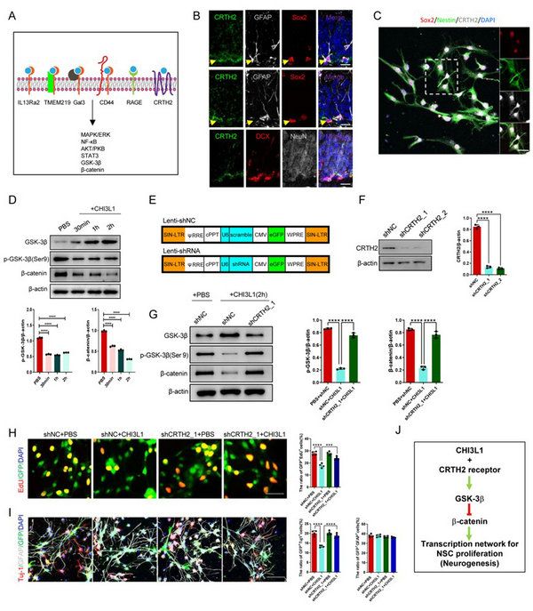 CHI3L1/CRTH2通過抑制β-catenin信號通路抑制NSCs增殖和分化:通過免疫熒光共標記發現,僅CRTH2在神經干細胞中表達。并發現CHI3L1蛋白刺激NSCs可以明顯抑制β-catenin的表達,而利用表達shRNA的慢病毒敲除NSCs中CRTH2后,β-catenin的表達得到了明顯恢復;同時發現,敲降CRTH2受體能夠挽救CHI3L1對神經干細胞增殖分化的抑制作用。因此,調控CHI3L1/CRTH2/β-catenin信號通路可以改善NMOSD小鼠模型中神經干細胞增殖分化缺陷(圖5)。