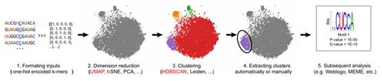 傳統的序列分析工具通常基于序列出現的頻率進行統計,從而獲得高頻出現的序列特征(即motif)。這些分析工具(如MEME,HOMER)為發現轉錄因子結合位點(TFBS)而設計——對于RNA修飾的motif發現并沒有進行優化。與TFBS的motif發現的情境不同,RNA修飾位點的序列是高度對齊的,且motif的長度往往很短。實際上,RNA編輯修飾motif的發現與單細胞測序中的可視化流程十分相似:RNA編輯修飾motif可以通過One Hot encoding轉化成高維向量,而這些高維向量可以通過Manifold法進行分解,(如UMAP,t-SNE)投影在二維平面上——與motif這一概念一致,如存在反復出現的相似的序列,它們將在二維投影的某個區域形成富集(高密度區域)。若能使用某種手段對投影進行聚類,并提取這些富集區域,就能夠以可視化的形式對給定序列進行分類以及motif的發掘。