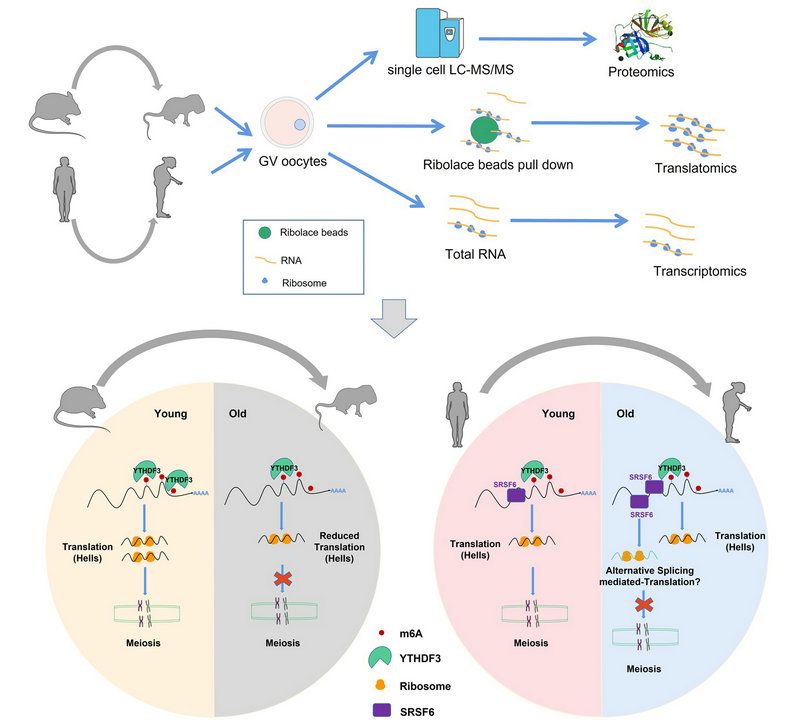 研究團(tuán)隊(duì)使用新的單細(xì)胞雙組學(xué)測(cè)序技術(shù)(T&T-seq)發(fā)現(xiàn),在小鼠衰老過(guò)程中,卵母細(xì)胞中大多數(shù)基因的翻譯效率顯著降低,并且與M6A識(shí)別因子YTHDF3的表達(dá)下降相關(guān)。干預(yù)YTHDF3影響了卵母細(xì)胞中HELLS基因的翻譯效率,進(jìn)而抑制了卵母細(xì)胞成熟。此外,團(tuán)隊(duì)進(jìn)一步分析了人類卵母細(xì)胞衰老過(guò)程中的翻譯圖譜,發(fā)現(xiàn)人與小鼠在翻譯圖譜和翻譯調(diào)控過(guò)程中存在不同。雖然在人類和小鼠卵母細(xì)胞衰老過(guò)程都觀察到減數(shù)分裂、DNA甲基化及RNA降解的調(diào)節(jié)因子相似的翻譯變化,但是人類卵母細(xì)胞衰老過(guò)程中的翻譯調(diào)控因?yàn)閅THDF3表達(dá)很低,因此并非由M6A介導(dǎo),而與剪接因子SRSF6相關(guān)。這提示,在臨床上改善生殖衰老,增加高齡卵母細(xì)胞的獲取和改善高齡卵母細(xì)胞的質(zhì)量,應(yīng)該著手于人的研究,其中可變剪切調(diào)控可能是改善人卵母細(xì)胞老化的關(guān)鍵步驟。測(cè)序技術(shù)的更新為有限的人的樣本提供了更多有力支持,將為我們進(jìn)一步改善臨床上老化卵母細(xì)胞的培養(yǎng)提供新的可能。