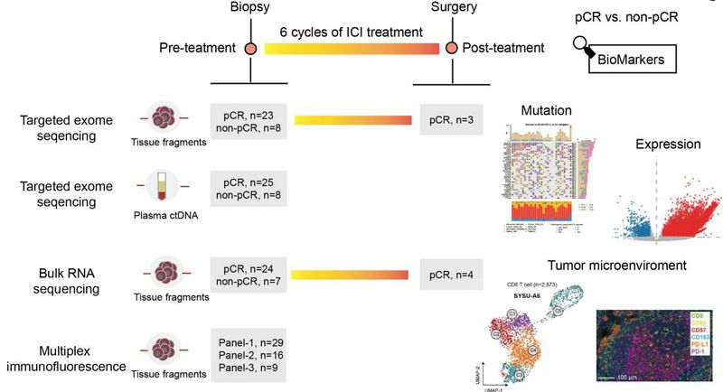 基于PICC試驗患者的樣本,研究團隊使用NGS測序技術分析了完全緩解患者和非完全緩解患者的基因組和轉錄組特征,并使用多重免疫熒光技術評估了腫瘤微環境,以確定可預測完全緩解反應的生物標志物。此外,研究團隊還整合了單細胞RNA測序數據及多重免疫熒光數據,來探索完全緩解反應相關免疫細胞的潛在可能機制。