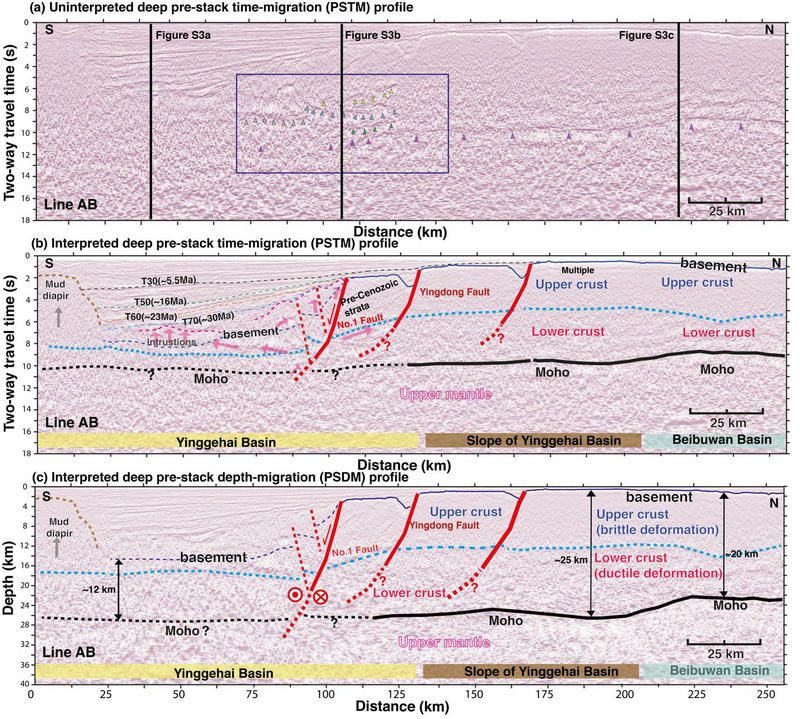 圖2 (a)未解釋的深反射疊前時(shí)間偏移剖面AB。紫色三角形指向莫霍面反射信號(hào)。藍(lán)色方框標(biāo)記了紅河斷裂北支一號(hào)斷裂下方地殼內(nèi)部不連續(xù)與錯(cuò)斷的反射同相軸,指示了紅河斷裂(即一號(hào)斷裂)的剪切作用形成了該區(qū)域復(fù)雜的反射地震信號(hào)。(b)解釋的深反射疊前時(shí)間偏移剖面AB。紅色(實(shí)線和虛線)表示解釋的深大斷裂。不同顏色的細(xì)虛線標(biāo)記了地層邊界。藍(lán)色實(shí)線和虛線代表解釋的沉積盆地基底。黑色實(shí)線和虛線代表解釋的莫霍面邊界。較粗的淺藍(lán)色虛線代表上地殼和下地殼的邊界。粉紅色箭頭指示巖漿侵入的可能路徑,粉紅色虛線表示巖漿侵入的頂部。Basement:沉積盆地基底;Upper crust:上地殼;Lower crust:下地殼;Moho:莫霍面;No. 1 Fault: 一號(hào)斷裂,即紅河斷裂在鶯歌海的北支;Yingdong Fault:鶯東斷裂;Intrusions:巖漿侵入;Upper mantle:上地幔。(c)與圖2b類似,但是為疊前深度偏移剖面AB。圖中數(shù)字代表地殼厚度。