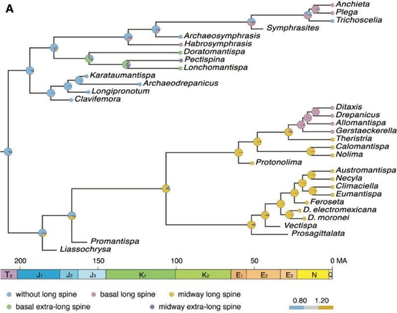 根據(jù)系統(tǒng)發(fā)育和幾何形態(tài)分析結(jié)果,螳蛉科起源于約兩億年前,分別在侏羅紀–早白堊世、古近紀兩個時期經(jīng)歷顯著的快速輻射演化,形成六個亞科,亞科間捕捉足股節(jié)形態(tài)高度多樣化,差異顯著。三維形態(tài)空間顯示捕捉足股節(jié)形態(tài)分異表現(xiàn)出三個階段:第一階段為中侏羅世–早白堊世,以絕滅的Mesomantispinae為代表的短刺型可能為股節(jié)形態(tài)的原始狀態(tài),通過祖先狀態(tài)重建,也證實了這一結(jié)論;第二階段為晚白堊世,形態(tài)空間開始發(fā)生分異,出現(xiàn)長刺型的Doratomantispinae;第三階段為新生代,形態(tài)空間發(fā)生多方向性的分異,現(xiàn)生亞科全部出現(xiàn)。