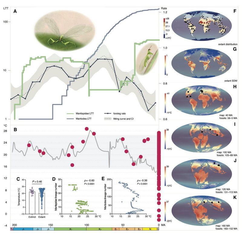 螳蛉科支系數(shù)變化與凈多樣化率表明,螳蛉科經(jīng)歷了兩個輻射期。第一次輻射演化發(fā)生在侏羅紀–早白堊世,推測為三疊紀末大滅絕事件導致空出大量新的生態(tài)位,隨著陸地生態(tài)系統(tǒng)的恢復,捕捉足的類型與屬種多樣性同步上升。但在第二個輻射期,螳蛉科支系多樣化滯后于前足演化速率。捕捉足在晚白堊世開始的快速演化,推測為被子植物的崛起,引發(fā)植物以及植食昆蟲引起的生態(tài)空間革新刺激了捕食器官的多樣化,為螳蛉的第二次物種輻射奠定了基礎(chǔ)。這一階段捕捉足與支系演化的不同步,可能是由于這一時期地球生態(tài)環(huán)境發(fā)生了變化。同樣具有捕捉足的螳螂目的支系數(shù)變化曲線顯示其自白堊紀以來快速輻射,由此帶來的生態(tài)競爭壓力可能是導致螳蛉在第二階段物種多樣化晚于前足演化的原因之一。此外,晚白堊世全球氣溫波動大,曾達到了近兩億年以來的最高溫。但基于化石與現(xiàn)生螳蛉的生態(tài)位模型分析發(fā)現(xiàn),螳蛉在演化歷史中對溫度的適應(yīng)性未發(fā)生過顯著變化,長期處于較溫暖的區(qū)域,而未到達過極熱的地區(qū),且螳蛉的支系數(shù)與溫度呈現(xiàn)更強的負相關(guān)。因此,93 Ma的C-T極熱事件及緊隨其后的溫度驟變可能是導致螳蛉在這一時期多樣性低的另一原因。當全球氣溫降至螳蛉的適生溫度后,其多樣性再一次升高;同時,得益于捕捉足在此前的多樣化,螳蛉在第二次輻射期占據(jù)了適應(yīng)于新生代捕食方式的生態(tài)位,在古近紀完成了第二次輻射。