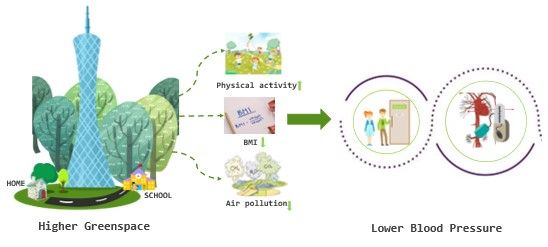 全球城鎮化進程加速,綠色空間銳減,人居環境質量正面臨嚴峻挑戰。正如哈佛生物學家愛德華·威爾森提出的“親生命性”假說揭示了自然環境與人的密切關系以及自然環境對人的有益影響。隨著研究的深入,綠色空間對心血管健康的保護作用逐漸得到關注。而兒童作為環境敏感人群,其心血管健康容易受外界環境因素的影響,且此時段的心血管健康水平能夠一定程度上預示成人期罹患心血管疾病的風險程度。然而目前大多數環境流行病學研究探索綠地對心血管保護作用時,主要將目光聚焦在成人人群,涉及兒童青少年的相關證據尚待探明。