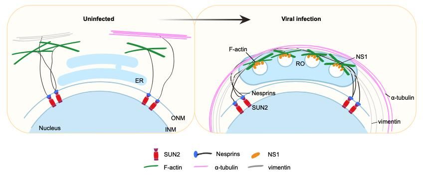 SUN2位于細胞內核膜,它是如何“遙控”細胞質骨架運動的呢?研究人員推測:SUN2可能通過與之相連的外核膜蛋白(Nesprins)傳遞機械力,來指導細胞質骨架的運動。免疫共沉淀實驗表明SUN2、Nesprin、actin和NS1的確存在互作;在病毒感染后,外核膜蛋白Nesprins以SUN2依賴的方式向核周聚攏。當破壞Nesprins結構完整性后,NS1與actin的互作減弱,表明SUN2與Nesprins共同介導了NS1-actin誘導的復制囊泡的形成。此外,Nesprins的負顯性表達,與SUN2敲除一樣,顯著下調病毒的復制水平。