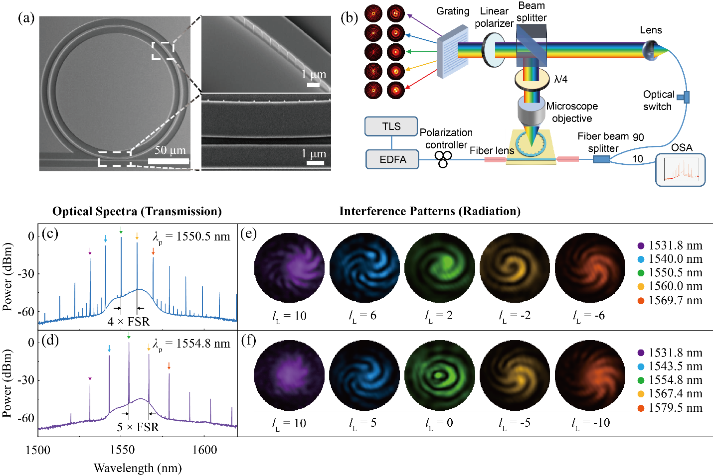 圖2. (a) 用于產生f-l梳的光柵微環器件掃描電子顯微鏡照片;(b) 實驗測試裝置圖;(c, d) 在1550.5 nm和1554.8 nm位置泵浦得到的光頻梳透過譜;(e, f) 梳齒對應的OAM拓撲荷數,此處的偽色指代不同的波長。