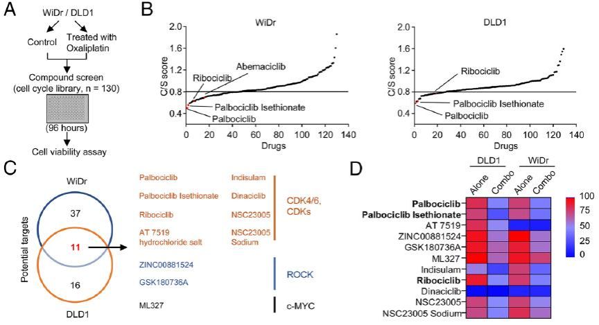 為了尋找治療靶點,研究團隊使用小分子抑制劑文庫進行高通量藥物篩選,發(fā)現(xiàn)CDK4/6抑制劑可以顯著提高奧沙利鉑藥效(圖3)。