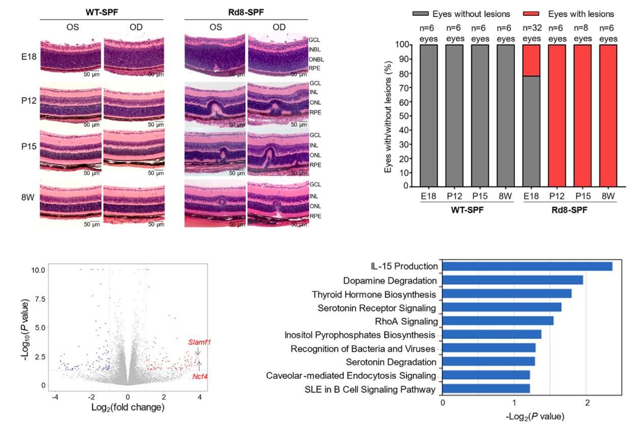 在胚胎階段并非所有Rd8小鼠都存在視網膜發育不良,但在出生后12天小鼠都出現了典型病變。RNA測序發現,Rd8小鼠視網膜中Slamf1和Ncf4這類“細菌與病毒識別”有顯著關聯的基因表達增高,促炎基因以及小膠質細胞和巨噬細胞浸潤基因也顯著上調,提示Rd8小鼠視網膜變性存在病原體的參與,而且伴有局部的先天免疫反應。