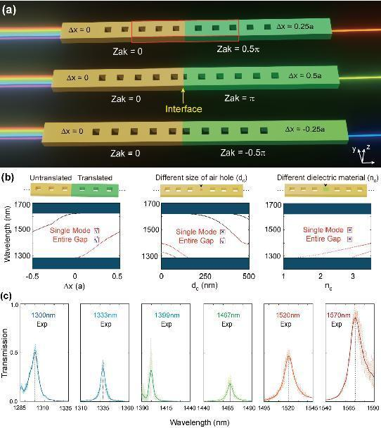 研究團(tuán)隊(duì)將光子晶體納米橋中空氣孔的“平移參數(shù)”作為新的合成維度,提出了一種基于合成平移維度的片上拓?fù)涔庾泳w納米橋?yàn)V波器的設(shè)計(jì)方案。如圖1(a)所示,將不同平移量的光子晶體納米橋拼接形成拓?fù)涔庾泳w納米橋微腔。由于拼接處左右光子晶體具有不同的扎克相位(Zak phase),因此界面處支持局域腔模。進(jìn)一步改變拼接處右側(cè)光子晶體的平移量,從而實(shí)現(xiàn)了不同波長(zhǎng)的光輸出。基于合成平移維度設(shè)計(jì)的拓?fù)涔庾泳w微腔相較于基于缺陷結(jié)構(gòu)的傳統(tǒng)光子晶體微腔具有多個(gè)優(yōu)勢(shì)。如圖1(b)所示,基于缺陷結(jié)構(gòu)的微腔存在腔模波長(zhǎng)覆蓋范圍窄或非單波長(zhǎng)濾波等問(wèn)題。然而,基于合成平移維度的拓?fù)湮⑶唬ㄟ^(guò)空氣孔平移量的改變,微腔腔模可以覆蓋整個(gè)光子晶體禁帶帶隙(>300 nm,覆蓋光通信波段的大部分O波段,整個(gè)E,S,C波段以及大部分L波段)。且每個(gè)微腔僅支持單個(gè)腔模,可以實(shí)現(xiàn)單波長(zhǎng)濾波。實(shí)驗(yàn)上,研究團(tuán)隊(duì)制備了具有不同平移量的片上拓?fù)涔庾泳w納米橋樣品,如圖1(c)所示的測(cè)量結(jié)果證實(shí)了片上拓?fù)涔庾泳w納米橋?yàn)V波器在寬波長(zhǎng)范圍內(nèi)的選擇性單波長(zhǎng)濾波。