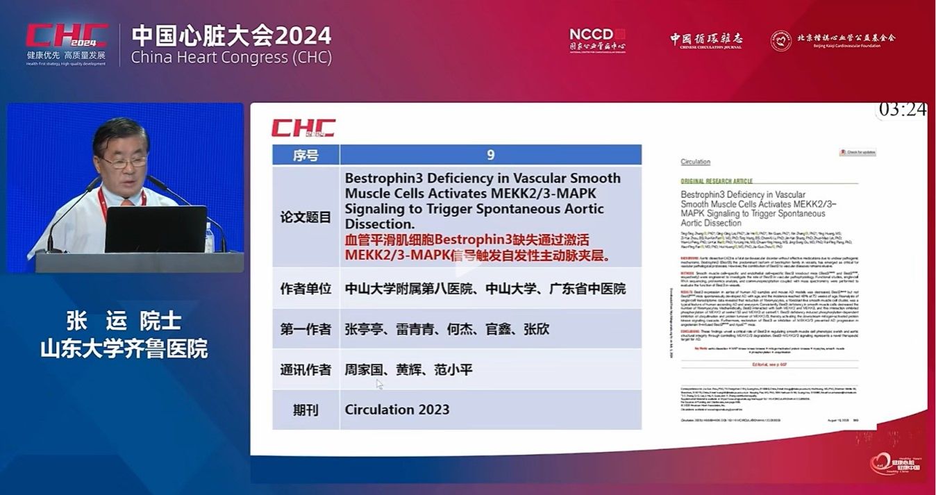 中大新聞網訊(通訊員宋蘭桂)日前,中國心臟大會(CHC)2024在北京開幕。會上公布了2023年度中國十大心血管基礎研究,附屬第八醫(yī)院黃輝教授團隊和中山醫(yī)學院周家國教授團隊合作發(fā)表在心血管領域頂尖學術期刊《循環(huán)》(Circulation)的論文“Bestrophin3 Deficiency in Vascular Smooth Muscle Cells Activates MEKK2/3–MAPK Signaling to Trigger Spontaneous Aortic Dissection(血管平滑肌細胞Bestrophin3缺失通過激活MEKK2/3-MAPK信號觸發(fā)自發(fā)性主動脈夾層)”入選2023年度中國十大心血管基礎研究。