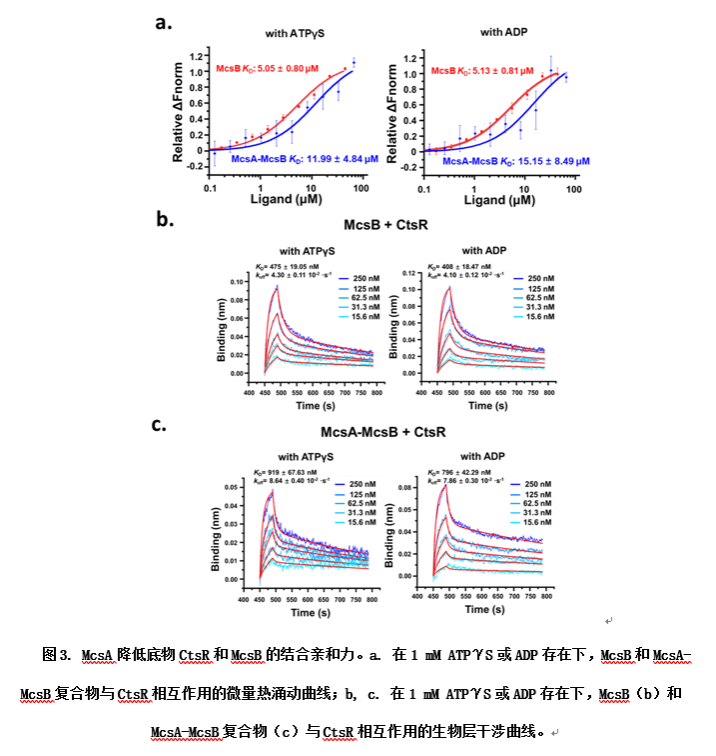 此外,結(jié)構(gòu)信息顯示McsA的結(jié)合位點(diǎn)接近McsB的底物結(jié)合口袋,表明McsA可能會干擾McsB和底物CtsR之間的相互作用。研究者通過微量熱涌動(Microscale Thermophoresis,MST)和生物層干涉(Bio-Layer Interferometry,BLI)等實(shí)驗(yàn)表明,McsA的結(jié)合會降低McsB對CtsR的結(jié)合親和力。重要的是,這種親和力的降低主要體現(xiàn)在解離速率的增加,表明了McsA的結(jié)合加速了磷酸化CtsR的離去速率從而加快了反應(yīng)循環(huán)。