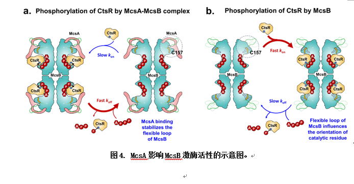 此項(xiàng)工作首次解析了激酶復(fù)合物McsA-McsB的冷凍電鏡結(jié)構(gòu),揭示了McsA通過鋅指結(jié)構(gòu)域及α螺旋與McsB結(jié)合,穩(wěn)定了McsB的關(guān)鍵催化半胱氨酸殘基C157并顯著降低了底物蛋白CtsR與McsB的結(jié)合能力,加速磷酸化CtsR的離去速率,從而增強(qiáng)McsB的精氨酸激酶活性,實(shí)現(xiàn)對CtsR的磷酸化修飾。這種磷酸化修飾通過McsA激活McsB后對CtsR的精準(zhǔn)調(diào)控,使得CtsR的抑制作用得以解除,從而迅速響應(yīng)環(huán)境變化,有效維持了細(xì)胞內(nèi)蛋白質(zhì)的質(zhì)量和功能穩(wěn)定。