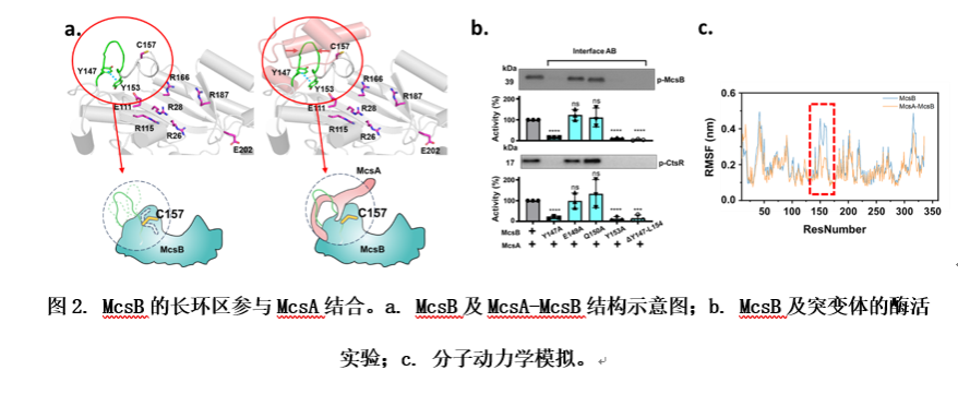 觀察McsB與McsA的相互作用面可知,McsB通過一段長環(huán)區(qū)與McsA的鋅指結(jié)構(gòu)域和兩個(gè)α螺旋完成相互作用。在單獨(dú)的McsB中,McsB長環(huán)區(qū)主要通過兩個(gè)酪氨酸殘基Y147和Y153形成典型的T型π-π堆積,以保持穩(wěn)定。值得注意的是,催化殘基之一的C157位于同一環(huán)區(qū)。若破壞該π-π堆積,則會擾亂催化殘基C157的朝向,最終導(dǎo)致McsB完全喪失激酶活性。由于McsB長環(huán)區(qū)的構(gòu)象對其激酶活性的關(guān)鍵作用,研究者推測McsA結(jié)合可能會穩(wěn)定該環(huán)區(qū),從而固定催化殘基C157的朝向,進(jìn)而加強(qiáng)McsB對CtsR的磷酸化修飾活性。為了驗(yàn)證假設(shè),研究者對McsB和McsA-McsB復(fù)合物結(jié)構(gòu)進(jìn)行了分子動力學(xué)(Molecular Dynamics,MD)模擬。RMSF分析表明,與McsA-McsB復(fù)合物結(jié)構(gòu)相比,McsB的一個(gè)區(qū)域(殘基I145-G164)的柔性大大增強(qiáng)。這一柔性區(qū)域包括McsB長環(huán)區(qū)域(殘基Y147-L154)和關(guān)鍵的催化殘基(Cys157)。這些發(fā)現(xiàn)揭示了McsA在穩(wěn)定和限制McsB長環(huán)區(qū)和保守催化Cys殘基的動態(tài)行為中的關(guān)鍵作用。