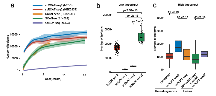 研究者將scRCAT-seq2在低通量與高通量條件下與多種三代測(cè)序技術(shù)(如SCAN-seq2、scISOr-seq、HIT-scISO-seq等)進(jìn)行對(duì)比分析,結(jié)果顯示scRCAT-seq2在成本效益和檢測(cè)靈敏度方面均具有顯著優(yōu)勢(shì)。(圖2)
