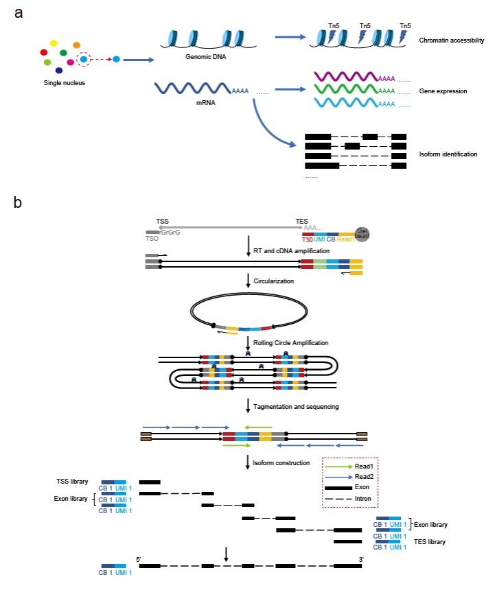 胡友金團(tuán)隊(duì)長(zhǎng)期專注于單細(xì)胞測(cè)序技術(shù)的創(chuàng)新開發(fā)。早在2020年,該團(tuán)隊(duì)已在《Nature Communications》上發(fā)表scRCAT-seq技術(shù),用于RNA isoform的檢測(cè)。此次,團(tuán)隊(duì)進(jìn)一步改進(jìn)原有方法,發(fā)展了scRCAT-seq2全長(zhǎng)轉(zhuǎn)錄組測(cè)序技術(shù),并結(jié)合10x Genomics的Chromium Next GEM Single Cell Multiome ATAC + Gene Expression平臺(tái),實(shí)現(xiàn)了染色質(zhì)可及性與RNA isoform同時(shí)檢測(cè)的多組學(xué)方法。其中,scRCAT-seq2的核心技術(shù)是通過單分子成環(huán)技術(shù)處理cDNA,并將覆蓋TSS,TES和exon的測(cè)序序列進(jìn)行同一標(biāo)簽標(biāo)記,并組裝構(gòu)建全長(zhǎng)cDNA序列。(圖1)