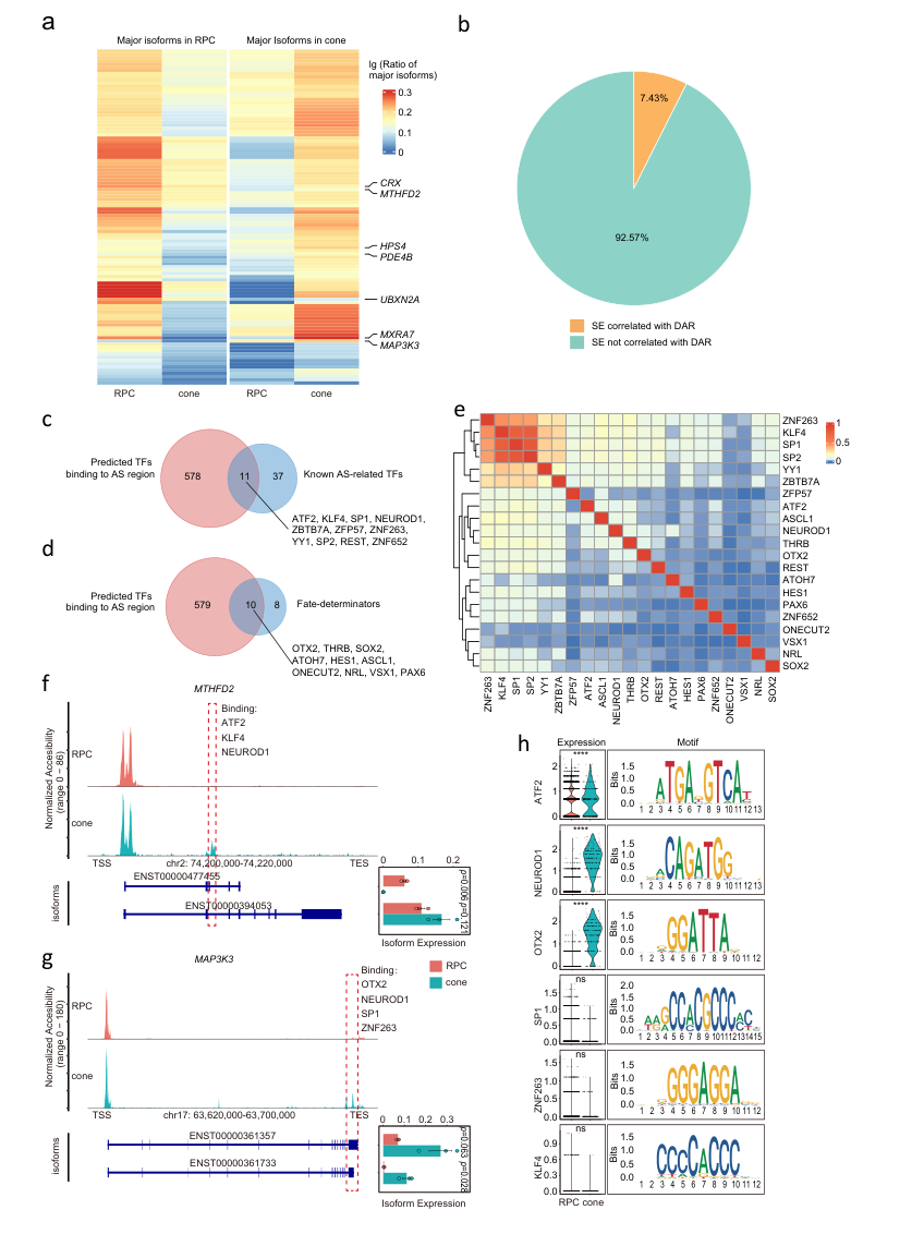 圖4:RPC發(fā)育過程中RNA isoform選擇與染色質(zhì)可及性和TFs的相關(guān)性