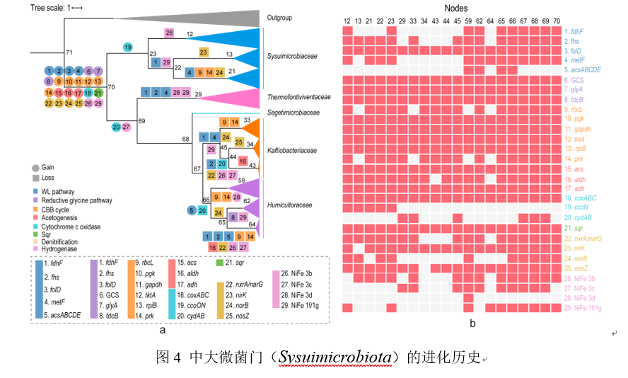 本研究從熱泉原始樣品的宏基因組數據中重構了CSP1-3類群的基因組,結合NCBI數據庫中的基因組,最終選取112條完整度大于80%,污染度小于5%的CSP1-3類群基因組進行分析。系統發育結果顯示,這112條基因組所代表的菌株屬于同一門,可劃分為5個不同的科,11個屬和25個種(圖1)。這些基因組所代表的菌株廣泛分布于世界各地,土壤和熱泉是適合該類群生存的生境(圖1)。基因組分析結果顯示,該門類群的菌株是兼性厭氧微生物,能通過還原性甘氨酸途徑(RGP)、卡爾文循環(CBB)和伍德-永達爾通路(WLP)進行碳固定實現自養生長,氫化酶的存在及硫化物的氧化是自養生長過程中主要的能量來源(圖2)。采用自養培養基在厭氧條件下對CSP1-3類群進行富集,熒光原位雜交(FISH)實驗及擴增子結果顯示,CSP1-3類群被成功富集且豐度有明顯的提高。同時,宏轉錄組及穩定同位素核酸探針(DNA-SIP)技術分析結果進一步證實了CSP1-3類群的化能自養功能(圖3)。進化分析表明,CSP1-3類群的祖先能通過RGP進行自養生長并產生乙酸,且該功能在該門類群之間進行垂直傳遞,而CBB、WLP和反硝化功能則是通過不同的水平基因轉移事件獲得(圖4)。最終,本研究將該門類群命名為中大微菌門(Sysuimicrobiota phy. nov.)。該研究通過多組學技術和富集培養手段,系統深入地探究了中大微菌門的多樣性,空間分布格局,參與的生態功能角色和進化歷史,拓展了對未培養細菌的認知,完善了熱泉微生物生態功能過程理論,也為極端環境微生物新資源的挖掘提供了一種可能的思路和策略。