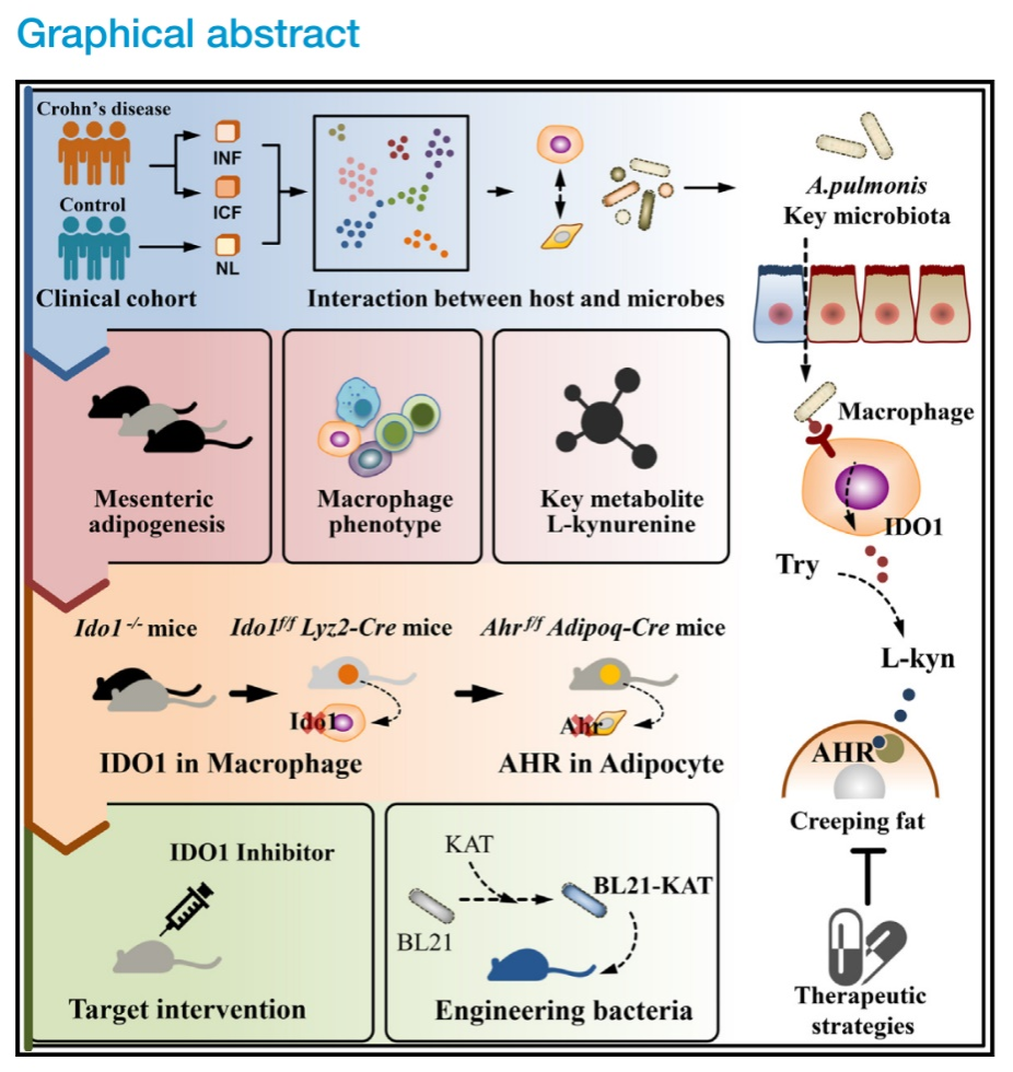 腸道微生物組成和功能的改變是導致CD發生發展的重要機制之一。蘭平教授、何真主任醫師團隊一直致力于克羅恩病的微生態研究,前期通過多組學研究以及腸鏡隨訪,結合體內外實驗驗證,發現腸系膜組織中定植的細菌可介導CD腸道炎癥的發生,并揭示關鍵毒力因子在其中的作用機制,相關研究結果發表于Microbiome(IF=13.8)、Advanced science(IF=14.3)等期刊上。此后,團隊進一步揭示了小分子化合物和新型益生菌在治療克羅恩病中的作用機制,建立了靶向腸道菌群改善腸道炎癥的新策略,相關研究結果發表于Molecular therapy(IF=12.1)、EBioMedicine(IF=9.7)等期刊上。然而,雖然臨床研究發現手術中擴大性切除腸系膜組織可明顯降低術后疾病復發率,但腸系膜微生物誘導克羅恩病爬行脂肪形成的作用機制尚未闡明。