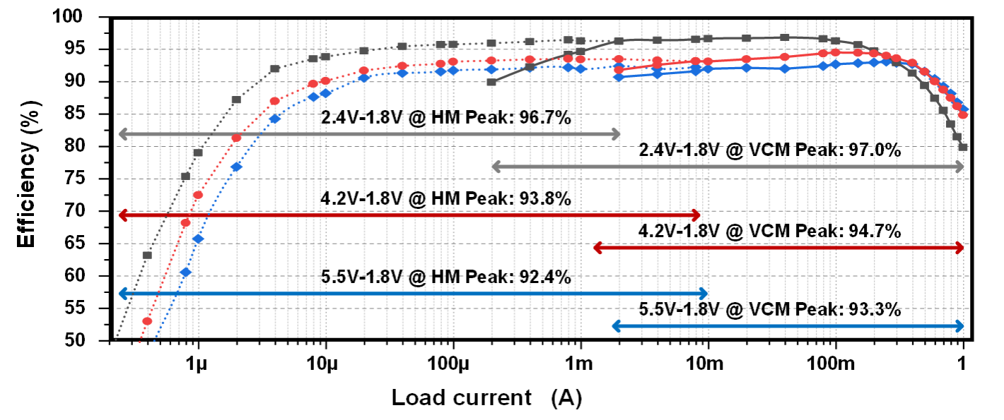 相關設計已在180nm BCD工藝下完成流片驗證。芯片測試結果表明,在單節鋰電池輸出的情況(2.7V-4.2V)下,該轉換器僅需約150nA靜態電流,實現了在10μA-500mA負載下大于90%的轉換效率。在物聯網設備對電池供電的苛刻要求下,該轉換器可以顯著延長電池壽命,在穿戴式電子設備、無線物聯網傳感器節點等領域中應用前景廣闊。