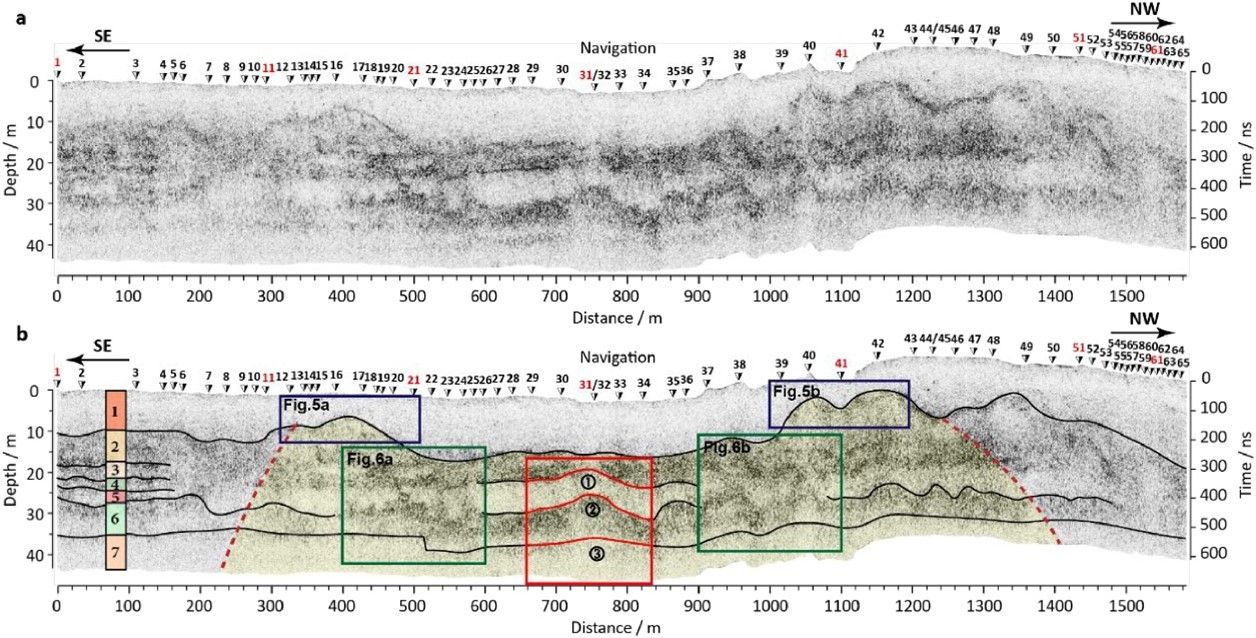 為深入剖析月球撞擊事件,張領副教授及其合作研究團隊利用中國嫦娥四號任務“玉兔二號”月球車搭載的探月雷達,對長達65個月球日、總計約1600米的巡視路徑所采集的數據進行了綜合分析。利用其高、低頻雙通道,實現了從淺到深、清晰連貫的地下結構成像(圖2、圖3)。