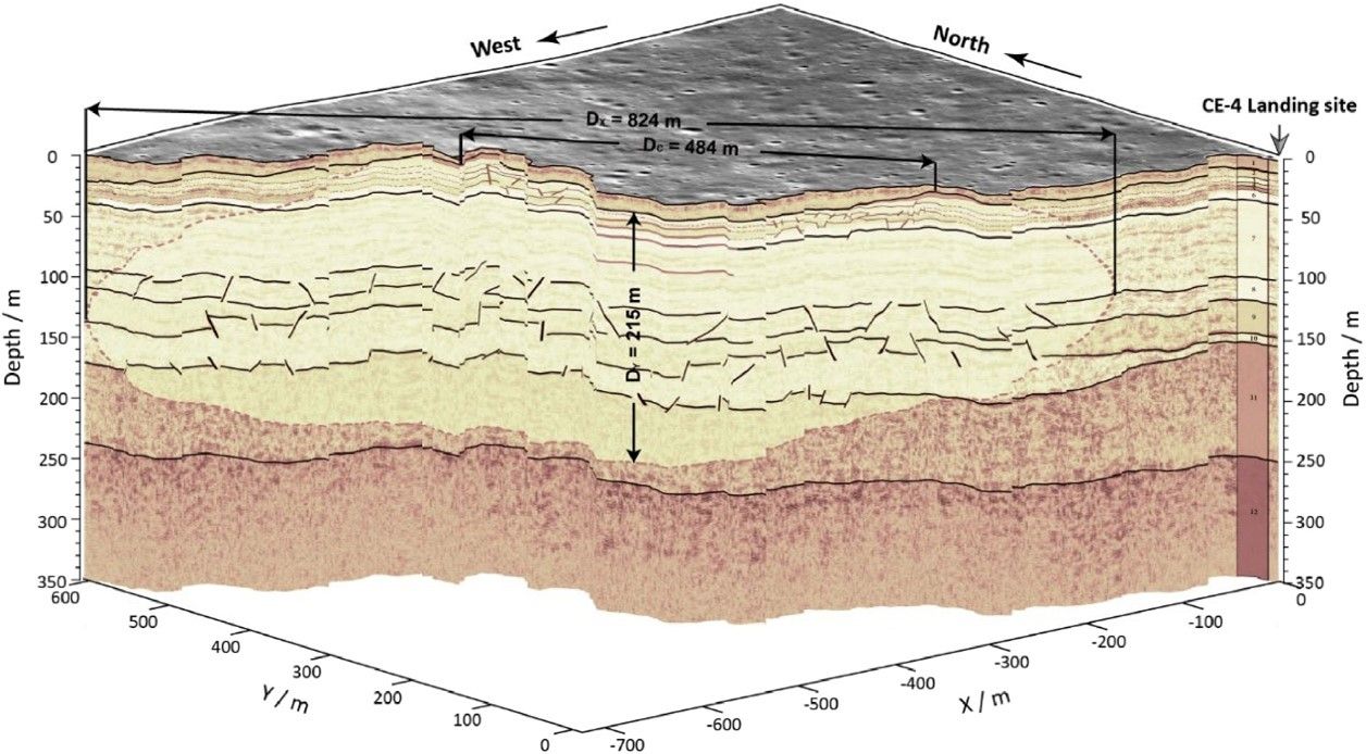 探月雷達結果顯示,在著陸區下方,掩埋著一個完整的古老埋藏撞擊坑。該撞擊坑直徑達484米,其引發的地下結構特征延伸至215米深處。通過綜合分析,研究團隊還構建了一個包含12層的地層結構(圖3),揭示了由月壤、古月壤層、濺射沉積和玄武巖單元構成的復雜地質序列。更重要的是,這些雷達圖像首次提供了撞擊坑地下改造過程的原位證據,清晰識別出典型的撞擊坑地下特征,包括:改造區、放射狀坍塌、中央回彈和深部斷裂系統(圖2b)。在此基礎上,還根據雷達數據的空間分布,重建了該撞擊坑的三維結構(圖4)。