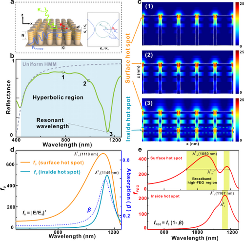 針對(duì)上述問題,他們首先在理論上提出考慮系統(tǒng)吸收損耗的場(chǎng)增強(qiáng)增益因子和最佳場(chǎng)增強(qiáng)增益模新概念,以實(shí)現(xiàn)比傳統(tǒng)共振模式更好的光學(xué)響應(yīng)增強(qiáng)。傳統(tǒng)上,人們采用場(chǎng)增強(qiáng)因子f0(λ)= |E(λ)/E0(λ)|2(E(λ)和E0(λ)分別表示當(dāng)波長(zhǎng)為λ時(shí),光子學(xué)系統(tǒng)中的總光場(chǎng)振幅和入射光場(chǎng)振幅)尋找共振模式(共振波長(zhǎng)即為使f0(λ)取最大值的波長(zhǎng),記為λ0),作為光與物質(zhì)相互作用增強(qiáng)的最優(yōu)選擇。但共振模式往往伴隨最大的吸收損耗,會(huì)顯著減少實(shí)際參與光與物質(zhì)相互作用的光子數(shù),從而大大降低共振模式帶來的光學(xué)響應(yīng)增強(qiáng)的實(shí)際效果。為此,他們提出場(chǎng)增強(qiáng)增益因子新概念fFEG(λ) = f0(λ)[1-β(λ)](β(λ)為光子學(xué)結(jié)構(gòu)對(duì)于波長(zhǎng)為λ的光子的吸收率),以尋找最佳場(chǎng)增強(qiáng)增益模(fFEG(λ)取最大值的波長(zhǎng)即為最佳增益模的波長(zhǎng),記為λF)用于增強(qiáng)光與物質(zhì)相互作用。理論模擬發(fā)現(xiàn):不僅最佳場(chǎng)增強(qiáng)增益模比共振模式有更顯著的光學(xué)響應(yīng)增強(qiáng),而且存在一個(gè)比共振模式更強(qiáng)的光學(xué)響應(yīng)增強(qiáng)寬帶區(qū),如圖1e所示。為實(shí)驗(yàn)證明場(chǎng)增強(qiáng)增益概念的有效性,他們通過單層MoS2與陣列雙曲超結(jié)構(gòu)相互作用的非線性光學(xué)響應(yīng),演示了存在一個(gè)比共振模式更強(qiáng)的非線性響應(yīng)寬帶區(qū),且最佳場(chǎng)增強(qiáng)增益模可導(dǎo)致超過20000倍的二次諧波信號(hào)增強(qiáng),約為相同條件共振模式所產(chǎn)生二次諧波增強(qiáng)的2倍,如圖2所示。