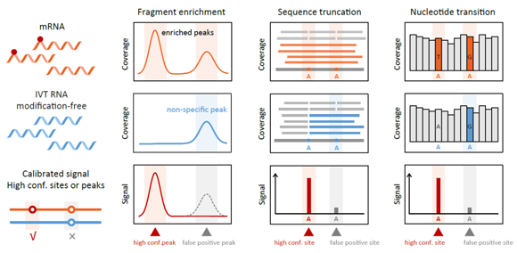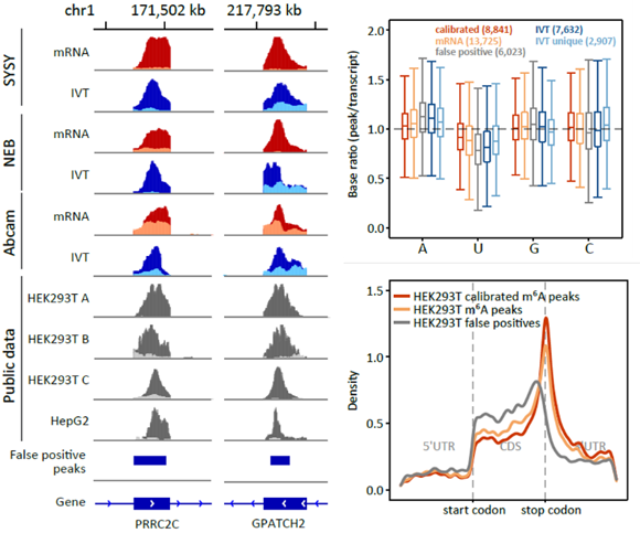 MeRIP-seq(或m6A-seq)是目前最常用的RNA修飾檢測方法,被大范圍的用在m6A相關研究中。該方法原理是用m6A特異性的抗體對片段化的RNA進行免疫沉淀反應,將含有m6A的片段富集出來進行測序。在研究同時對體外轉錄IVT RNA文庫也進行MeRIP-seq,結果表明即使是對不含m6A修飾的IVT RNA文庫,抗體依舊能夠富集到大量RNA片段,并且這些富集的“peak”在已發表結果數據中重復出現,表明MeRIP-seq其實受到假陽性信號的嚴重干擾。分析IVT RNA中被富集下來的區域,發現這些區域所在的基因表達量較高且富含腺嘌呤。去除假陽性信號后,鑒定出來的修飾區域更準確(圖3)。