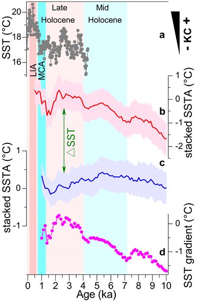研究團(tuán)隊(duì)利用長(zhǎng)鏈烯酮標(biāo)志物方法,重構(gòu)并分析了沖繩海槽沉積巖芯柱中的海表溫度(SST)信號(hào)(圖1),并結(jié)合現(xiàn)有SST研究記錄和數(shù)據(jù)。結(jié)果發(fā)現(xiàn),在約3/4千年的晚全新世時(shí)期以來,KC/NPSG明顯增強(qiáng)(圖2)。