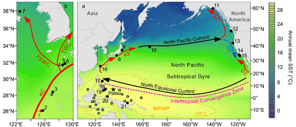 北太平洋副熱帶環(huán)流(North Pacific subtropical gyre, NPSG)是由北赤道流、黑潮(Kuroshio Current,KC)及其延伸體、加里福尼亞流以及太平洋洋流等構(gòu)成,位于北太平洋海域的環(huán)流圈。KC/NPSG因攜帶了源自西太暖池的熱量且在沿途中逐漸釋放,從而顯著影響太平洋及其周邊局地海陸氣候和生態(tài)環(huán)境。因此,研究KC/NPSG的千-百年際變化及其驅(qū)動(dòng)要素對(duì)精準(zhǔn)預(yù)測(cè)未來氣候變化有著非常重要的意義。
