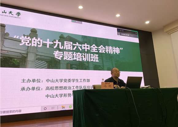 中大新聞網12月11日廣州電(通訊員陳潔)12月9日下午,我校學工系統舉辦黨的十九屆六中全會精神專題培訓班。本次培訓班由黨委學生工作部主辦,高校思想政治工作隊伍培訓研修中心(中山大學)以及中山大學形勢與政策研究所承辦,旨在進一步貫徹落實黨的十九屆六中全會精神,深刻把握、學深悟透習近平總書記重要講話和《中共中央關于黨的百年奮斗重大成就和歷史經驗的決議》的豐富內涵、精神實質,從黨的百年奮斗中汲取智慧和力量,深化拓展黨史學習教育。