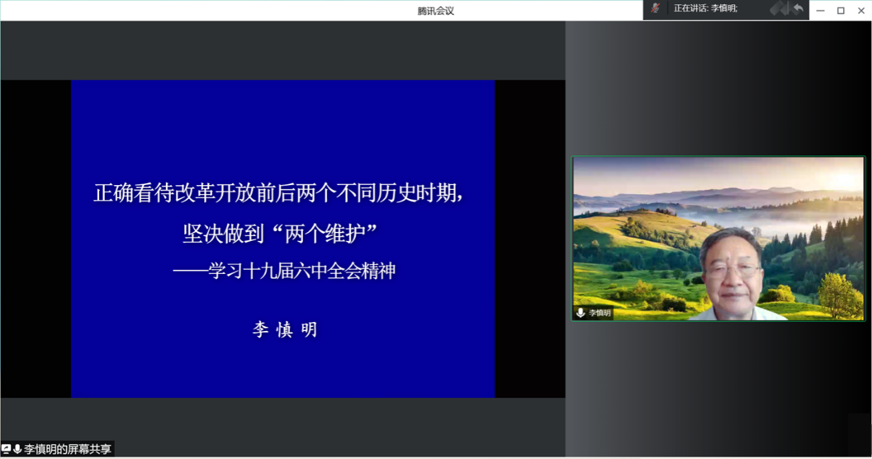 中大新聞網廣州5月27日電(通訊員陳潔)5月21日, 第十二屆全國人大常委會委員、第十二屆全國人大內務司法委員會副主任委員,中國政治學會會長,中國社會科學院原副院長、黨組副書記,世界社會主義研究中心主任李慎明研究員應邀為中山大學師生作十九屆六中全會精神專題講座。本次講座的題目為《正確看待改革開放前后兩個不同歷史時期,堅決做到“兩個維護”——學習十九屆六中全會精神》。中山大學《形勢與政策》課師資培訓班骨干教師、第二十五期學生馬克思主義理論研修班學生、青年團員骨干、馬克思主義學院學生代表共300多名師生通過線下線上方式參加了本次講座。