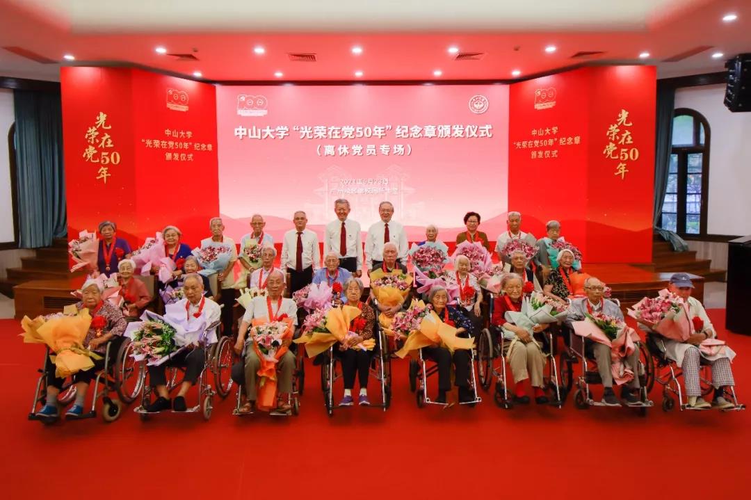 隨后,陳春聲書記、羅俊校長為在場離休黨員代表逐一頒發“光榮在黨50年”紀念章并合影留念,學生代表獻花致敬。