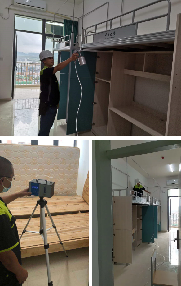 7月20日對部分室內設施安裝齊全的宿舍進行了首批空氣治理,并于7月28日進行檢測,宿舍內空氣質量各項指標均符合《室內空氣質量標準》(GB/T 18883-2002)的要求(甲醛、苯、胺、TVOC等含量)。8月16-18日對已完成家具設備安裝且今年入住的學生宿舍進行空氣治理,并將于8月22日進行第三方檢測,務必保證每間宿舍的空氣質量均符合標準要求。