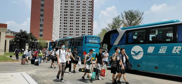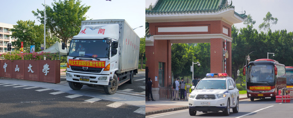 運輸行李的貨車和運送師生的客車分批駛出廣州校區(qū)東校園 肖遙、黃驊攝