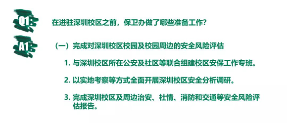 在進(jìn)駐深圳校區(qū)前,保衛(wèi)辦未雨綢繆,做好充分準(zhǔn)備工作。進(jìn)駐深圳校區(qū)后,保衛(wèi)辦及時(shí)排查,解決校區(qū)安全盲點(diǎn),為學(xué)校師生進(jìn)駐保駕護(hù)航。為讓大家更深入地了解深圳校區(qū)安保工作情況,我們準(zhǔn)備了這份深圳校區(qū)“安全保衛(wèi)Q&A”。