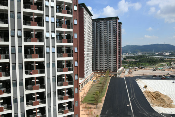 盡管近期天氣酷熱難當,但是深圳校區工程建設仍有條不紊地進行,工地上進出的工程車川流不息,施工人員揮汗如雨堅守崗位。七棟落成的嶄新的學生宿舍樓并排而立,從運動場外極目遠眺,在藍天白云紅花映襯下分外靚麗。