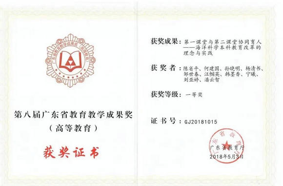海洋科學學院育人成果獲得第八屆廣東省教育教學成果一等獎(來源:海洋科學學院)