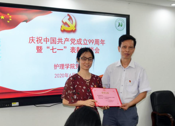 接著是頒獎(jiǎng)環(huán)節(jié)。護(hù)理學(xué)院黨委書記陳昌齡為獲得“優(yōu)秀黨務(wù)工作者”稱號(hào)的何笑霞同志、獲“優(yōu)秀共產(chǎn)黨員”稱號(hào)的李琨同志頒發(fā)證書。