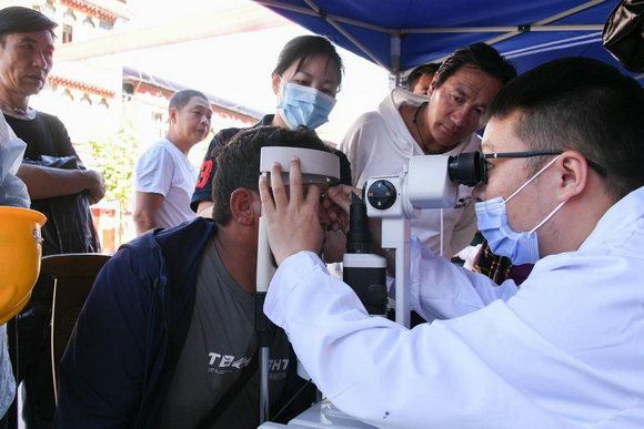 眼科宮海軍主治醫(yī)師為當(dāng)?shù)厝罕姍z查眼睛(來(lái)源:孫逸仙紀(jì)念醫(yī)院)