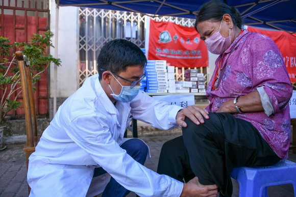 骨外科李玉希主治醫(yī)師在義診現(xiàn)場(chǎng)為老奶奶提供診療(來(lái)源:孫逸仙紀(jì)念醫(yī)院)