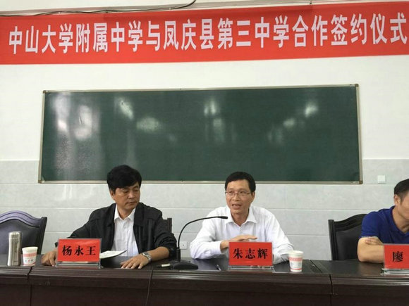 教育扶貧是根本性的、可持續的減貧手段。2015年鳳慶第三中學成立之初,學校的行政管理、教學設施和師資力量方面都還處于起步階段。因此,鳳慶三中校長段成雙想到可以向朱志輝尋求幫助,看看中大能不能在學校建設和教學資源上施以援手。朱志輝接到這一請求后,十分掛心鳳慶三中的建設。鳳慶三中的學生們大多來自各個鄉鎮,對鳳慶三中開展教育幫扶能有效促進當地教育資源的均衡與下沉,讓更多鄉鎮學生也能接受優質的教育資源。于是,他連假期也不休息,馬不停蹄地趕到廣州,與中山大學附屬中學校長廖珂溝通對接。雙方一拍即合,開啟了兩校合作辦學的新項目,牽起這段跨越千里的情緣。9月,朱志輝親眼見證了兩校合作簽約的儀式。中大附中自2015年起,對鳳慶三中開展為期五年的教學幫扶,兩校一起攜手共同進步,阻斷貧困在鳳慶的代際傳遞。