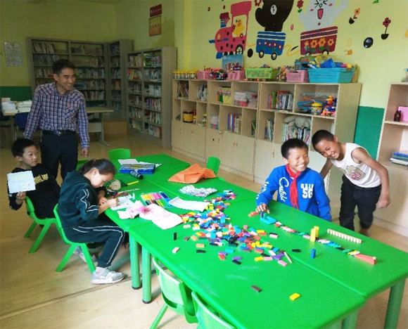 郭興勇與孩子們課后做益智游戲(來源:校工會)