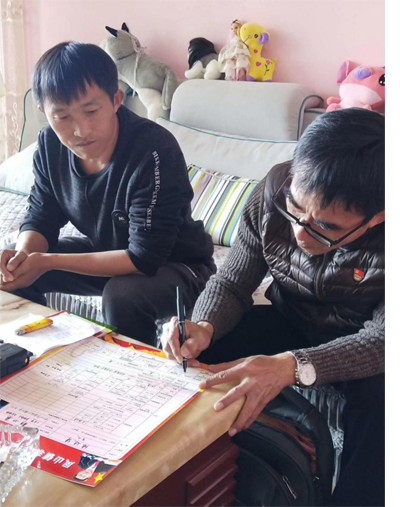 郭興勇(右)在紅塘村張廷華家核實紅卡信息(來源:校工會)